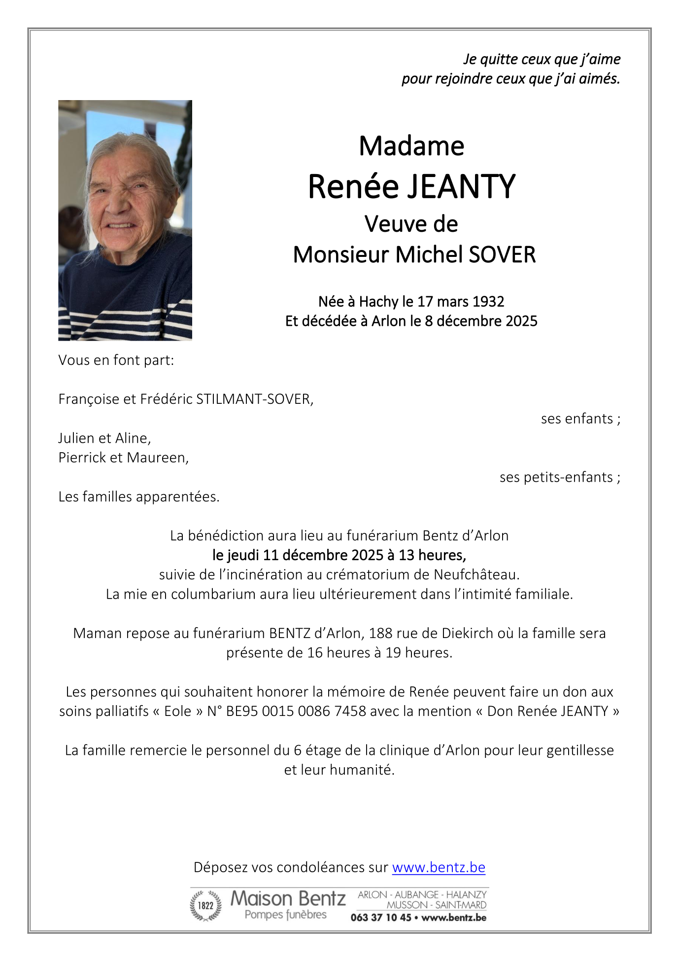 Décédée à Arlon (6700) le lundi 8 décembre 2025 à l'âge de 93 ans