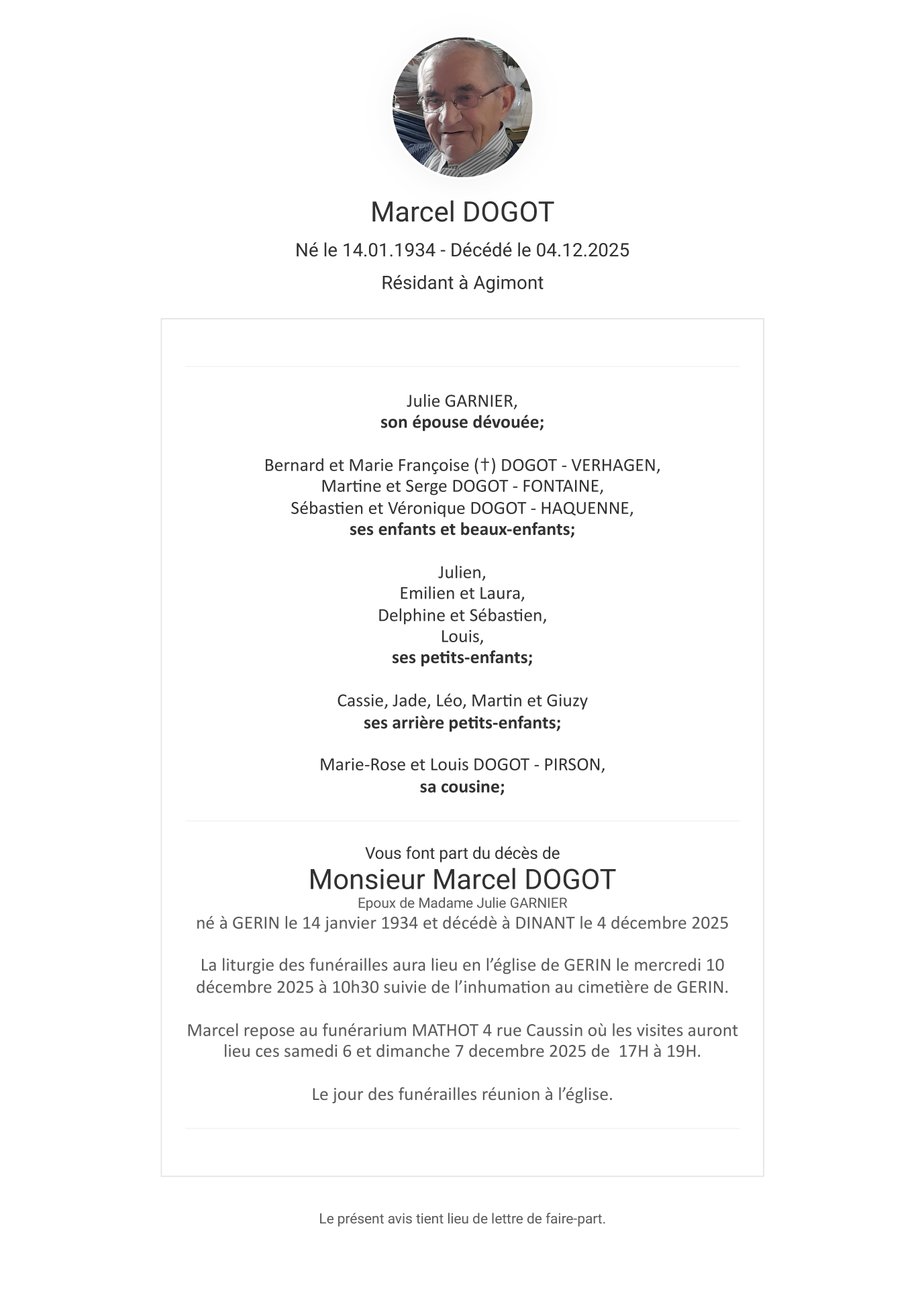 Décédé à Dinant (5500) le jeudi 4 décembre 2025 à l'âge de 91 ans